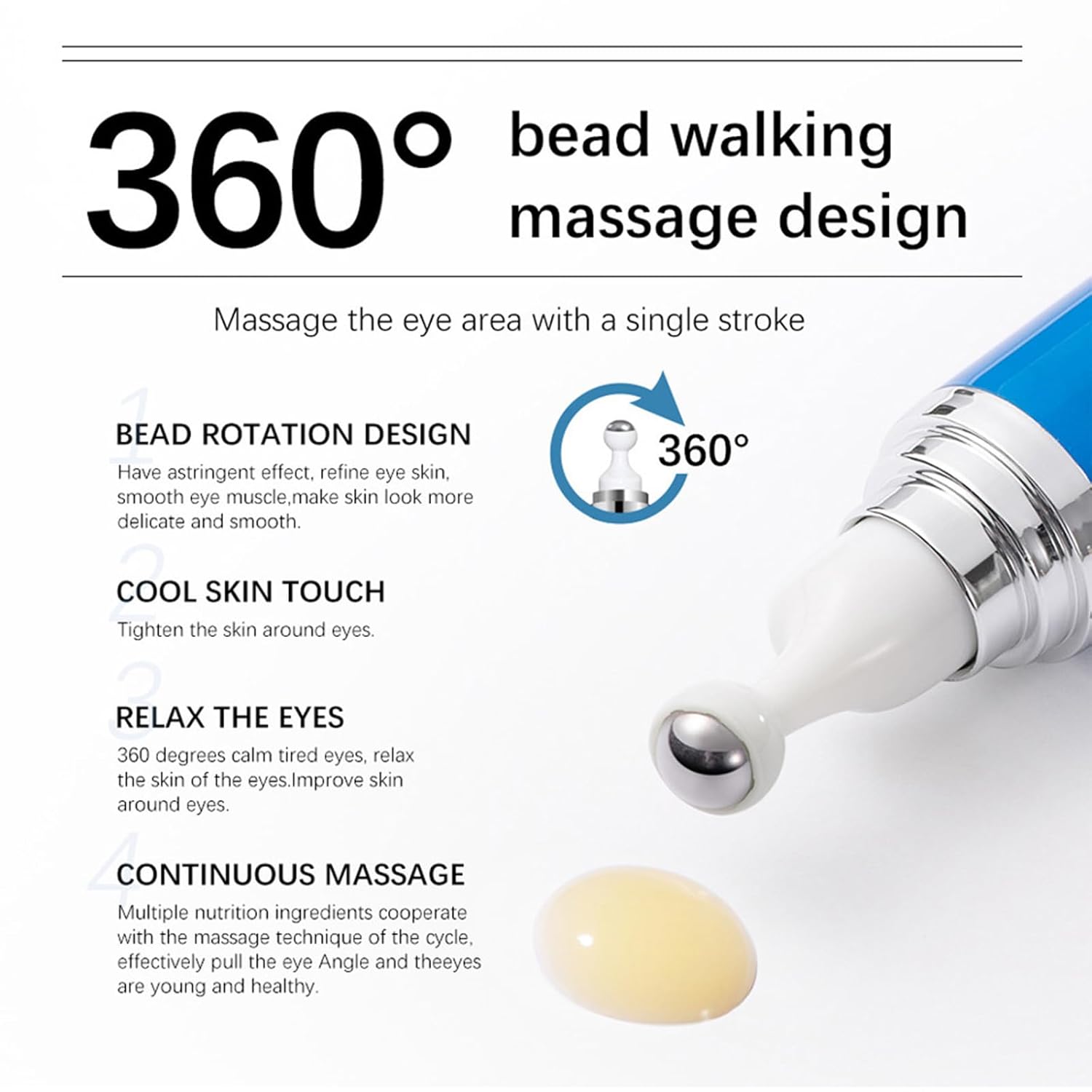 360°Roller Massage Ball Eye Serum: With an unique 360°cooling stainless steel roller-ball applicator, the under eye cream is evenly distributed around the eyes, fully massaging the contours of the eyes, relaxing the eyes, smoothing wrinkles and restoring firmness